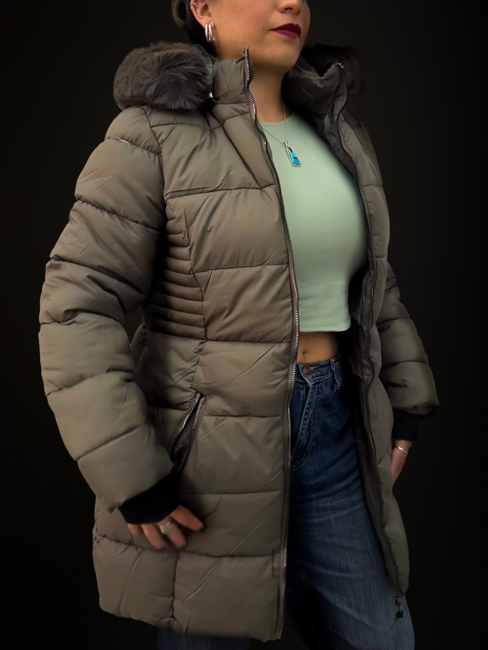 Chamarra Puffer Larga con gorra desmontable en tela peluche.